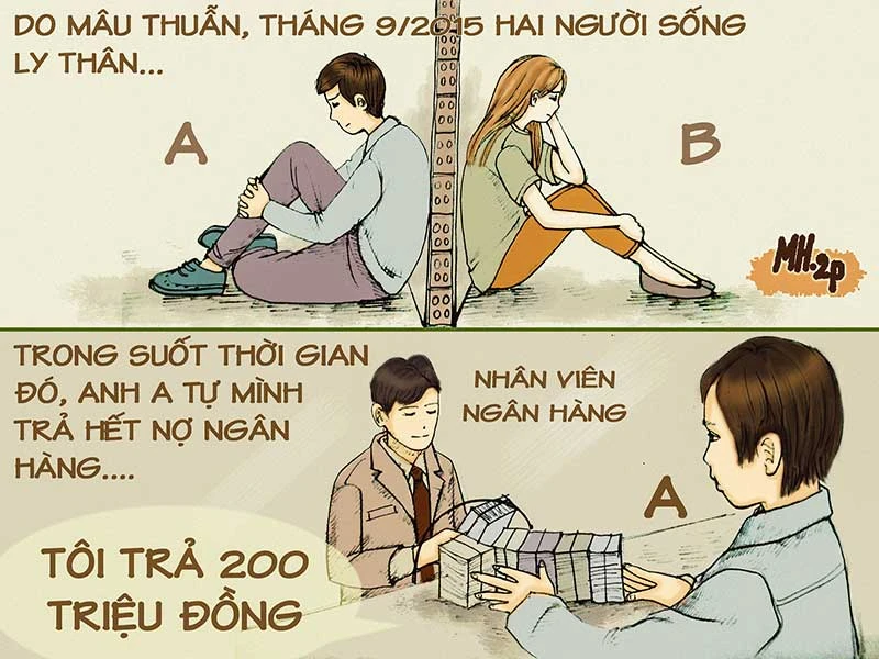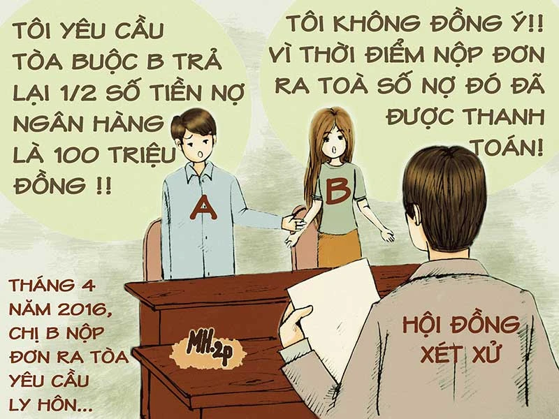 Trong thời gian này, công việc của anh A gặp nhiều thuận lợi. Nhiều lần anh A “trúng mánh” nên tự mình thanh toán hết số nợ đã vay của ngân hàng. Trong khi đó, chị B thấy rằng mâu thuẫn giữa mình với chồng là không thể hàn gắn nên tháng 4-2016 đã nộp đơn ra tòa xin ly hôn. Thấy vợ cạn tình, anh a cũng cạn nghĩa nên đã yêu cầu HĐXX tuyên buộc chị B phải có nghĩa vụ trả lại một nửa số tiền đã vay ngân hàng. Thế nhưng chị B nhất quyết: “Tôi không đồng ý vì tại thời điểm nộp đơn ra tòa số nợ đã được thanh toán”.