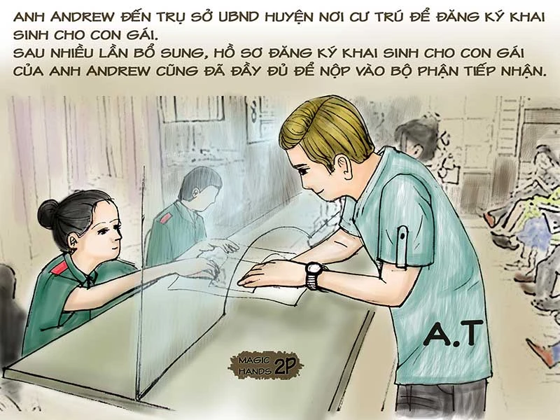 Đến cuối năm 2016, chị A sinh được một đứa con gái. Nghe tin, anh Andrew liền về Việt Nam để thăm vợ con. Sung sướng vì được làm cha, anh Andrew đặt tên cho con là Nhã Lily Thomas và nhờ người nhà hướng dẫn để đi làm thủ tục đăng ký khai sinh. Ngày 3-1-2017, anh Andrew đến trụ sở UBND huyện nơi cư trú để hỏi các thủ tục đăng ký khai sinh cho con gái. Với sự hướng dẫn của cán bộ tư pháp, sau nhiều lần bổ sung, hồ sơ đăng ký khai sinh cho con gái của anh Andrew cũng đã đầy đủ để nộp vào bộ phận tiếp nhận.