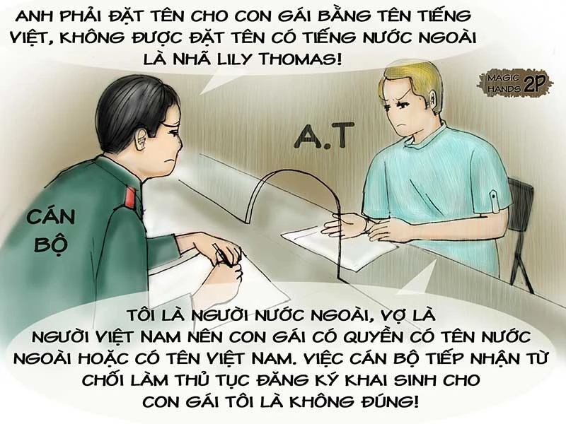 Tuy nhiên, cán bộ tiếp nhận lại từ chối thực hiện đăng ký khai sinh cho con gái anh Andrew với cái tên Nhã Lily Thomas. Theo cán bộ tiếp nhận, anh Andrew phải đặt tên cho con gái bằng tên tiếng Việt, không được đặt bằng tên có tiếng nước ngoài. Anh Andrew không đồng ý: “Tôi là người nước ngoài, vợ là người Việt Nam nên con gái có quyền có tên nước ngoài hoặc có tên Việt Nam”. Từ đó, anh Andrew cho rằng cán bộ tiếp nhận từ chối làm thủ tục đăng ký khai sinh cho con gái anh là không đúng.
