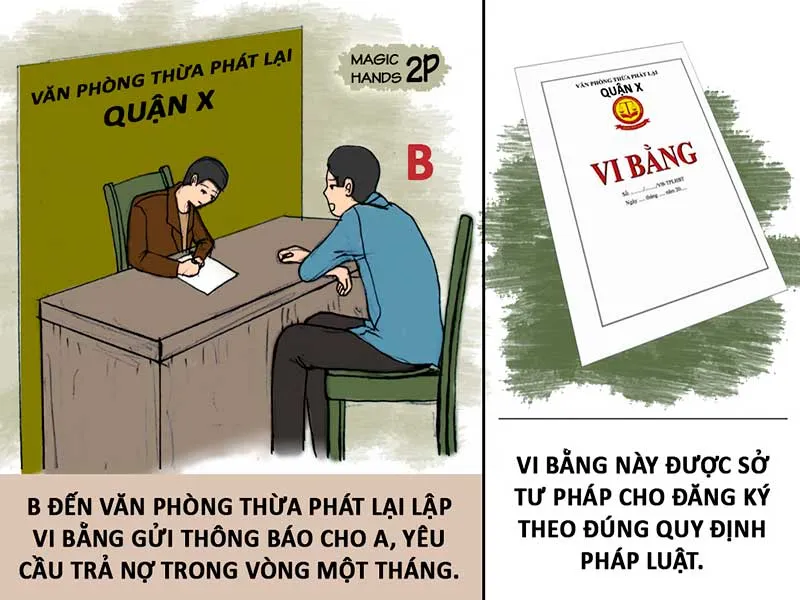 Hết cách, anh B đã làm văn bản thông báo yêu cầu anh A phải trả nợ trong vòng một tháng kể từ ngày nhận thông báo này. Đồng thời, anh B đến văn phòng TPL quận X nhờ lập vi bằng về việc gửi thông báo cho anh A. Mặc dù anh A không chịu nhận thông báo nhưng vi bằng của TPL đã ghi nhận đầy đủ về việc anh B đã gửi thông báo cho anh A. Vi bằng này được Sở Tư pháp cho đăng ký theo đúng quy định của pháp luật.
