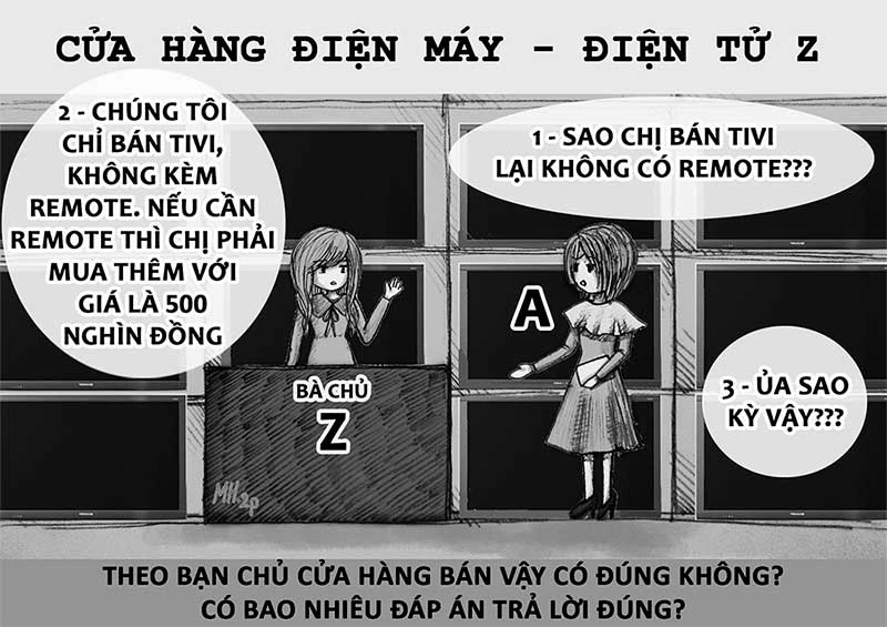 Khi đến cửa hàng điện máy - điện tử Z, mẹ con chị A rất thích cái tivi màn hình phẳng của một hãng nổi tiếng nên hỏi giá. Bà chủ cửa hàng Z đảm bảo với chị A cửa hàng mình bán tivi này rẻ hơn các cửa hàng khác 500.000 đồng. Nghe vậy chị A đồng ý mua. Khi đem tivi về nhà thử, hai mẹ con chị A phát hiện thiếu cái điều khiển từ xa (remote) nên quay lại cửa hàng yêu cầu đưa thêm. Tuy nhiên, bà chủ cửa hàng Z không đồng ý đưa cái điều khiển từ xa vì cửa hàng mình chỉ bán tivi, không kèm điều khiển nên giá mới rẻ hơn các cửa hàng khác 500.000 đồng. Không có cái điều khiển từ xa, gia đình chị A vẫn có thể sử dụng tivi bình thường, chỉ là hơi mất công một tí. Nếu chị A muốn có thêm cái điều khiển thì phải mua với giá 500.000 đồng.