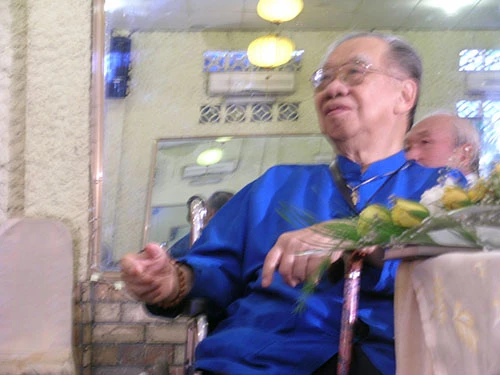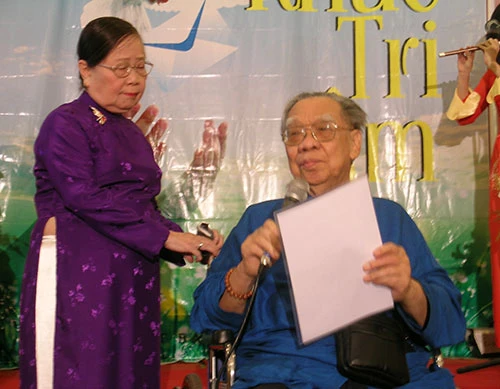 Tuy ngồi trên xe lăn nhưng hiền huynh Trần Văn Khê vẫn ngâm thơ tặng hiền muội Tôn Nữ Hỷ Khương tại buổi ra mắt tập thơ Khúc tri âm (2010). Ảnh: Nguyễn Tý