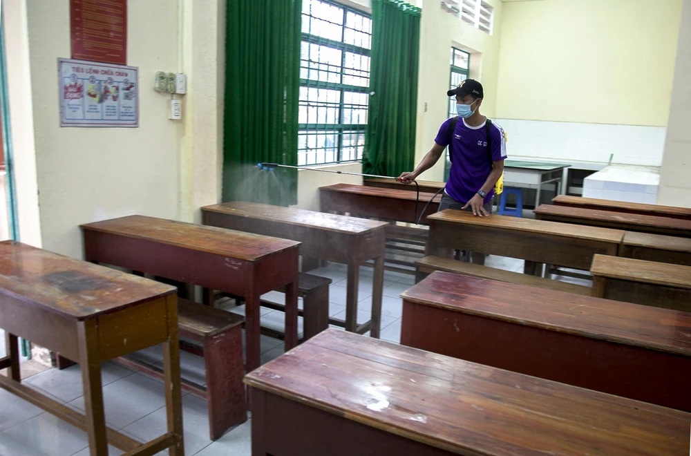 Ngành giáo dục tỉnh Kiên Giang tổ chức phun xịt, khử trùng các điểm thi. Ảnh: HIẾU LÂM
