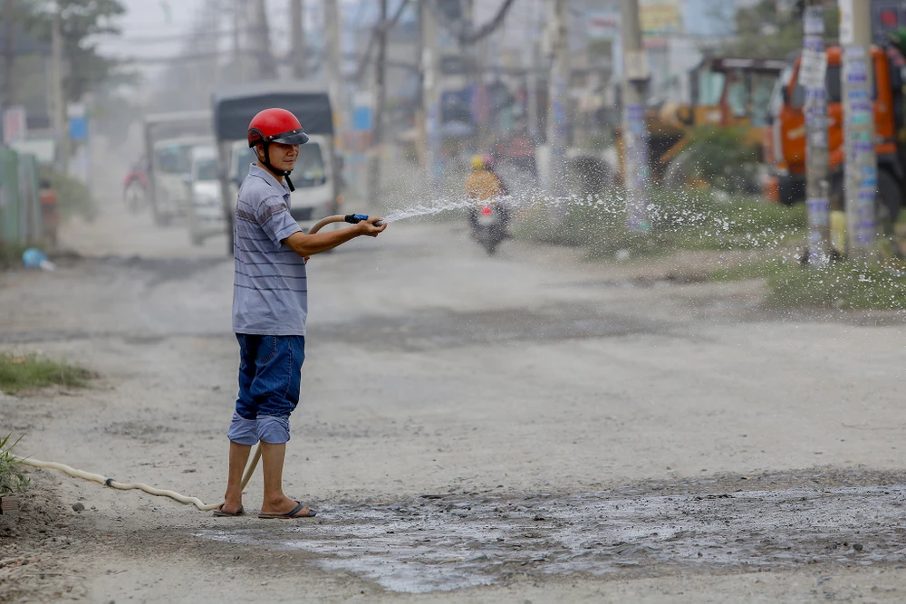 Người dân xịt nước, "giải cứu" cho đoạn đường bụi mù.