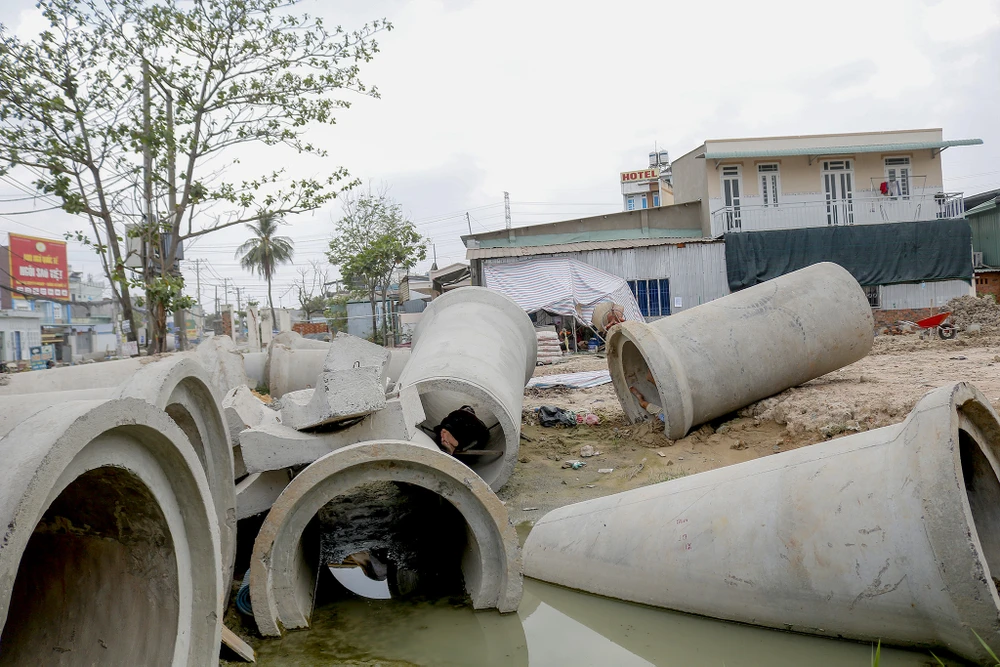 Ống cống ngổn ngang và nhiều khu vực trũng nước.
