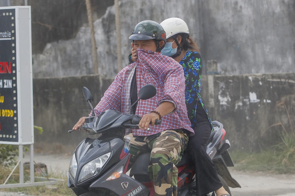 Bụi trắng như sương mù che mất tầm nhìn của người đi đường. Nhiều người chọn cách bật đèn xe để di chuyển trên con đường ngập bụi này.