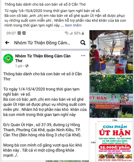Một quán cơm trên đường Lý Hồng Thanh (quận Ninh Kiều) cũng đăng tải trên Facebook thông tin hỗ trợ cơm miễn phí cho bà con bán vé số.