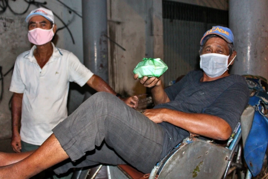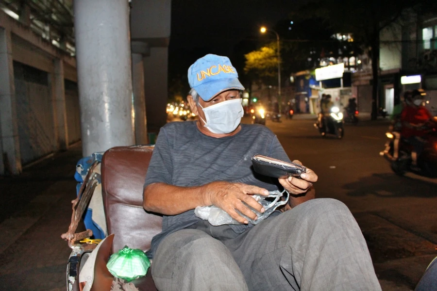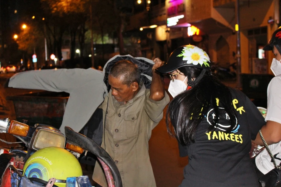 Ông Nguyễn Văn Lượm ngụ quận 5, làm nghề bơm vá xe ở góc đường Hai Bà Trưng (quận 1) đã hơn 40 năm. Vợ của ông Lượm bán vé số dạo. Trong đợt dịch hồi tháng 4-2021, vợ chồng ông đều thất nghiệp. Khi TP bình thường mới, ông lại lao vào guồng quay mưu sinh. Công việc bơm vá xe vốn bấp bênh nay càng thêm khó khăn. Khi được nhóm bạn trẻ tặng áo khoác, ông Lượm xúc động: "Lần đầu tiên, tôi được người ta tặng cho áo khoác. Trước giờ, tôi không mua và chưa dám nghĩ tới việc mua áo khoác. Mấy nay lạnh, tôi lấy áo mưa quấn cho ấm". Ảnh: NGỌC LÀI