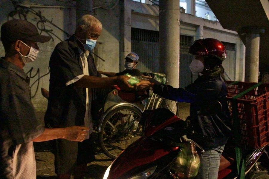 Những phần xôi, bánh, sữa... đủ để no bụng, được trao tận tay người cần. Chị Trinh dùng tiền cá nhân, bạn bè, người thân đóng góp để mua bữa tối tặng mọi người. Ảnh: NGỌC LÀI