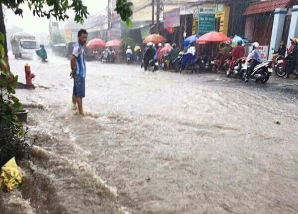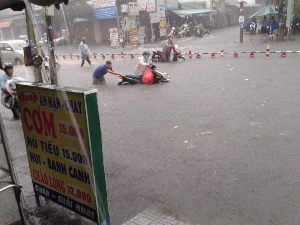 Còn thanh niên trẻ này cố đẩy chiếc xe máy bị ngập gần nửa bánh xe của một phụ nữ để vượt qua điểm ngập nặng tại chân cầu Săn Máu (đường Nguyễn Ái Quốc, phường Tân Hiệp, TP Biên Hòa). Ảnh: Facebook