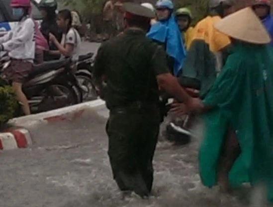 Trong khi đó, một chú bộ đội dừng xe giúp dẫn bà cụ băng qua con đường Đồng Khởi (phường Tân Phong, TP Biên Hòa) nước đang dâng cao. Ảnh: Facebook