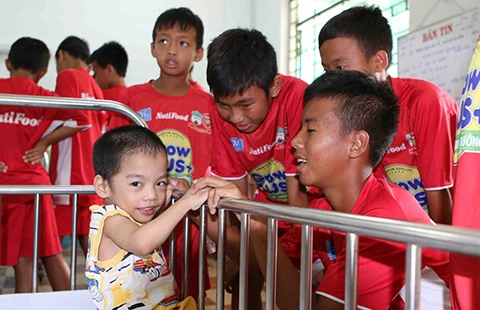 Các cầu thủ nhí Học viện NutiFood vui đùa với những trẻ em có hoàn cảnh đặc biệt. Ảnh: DH