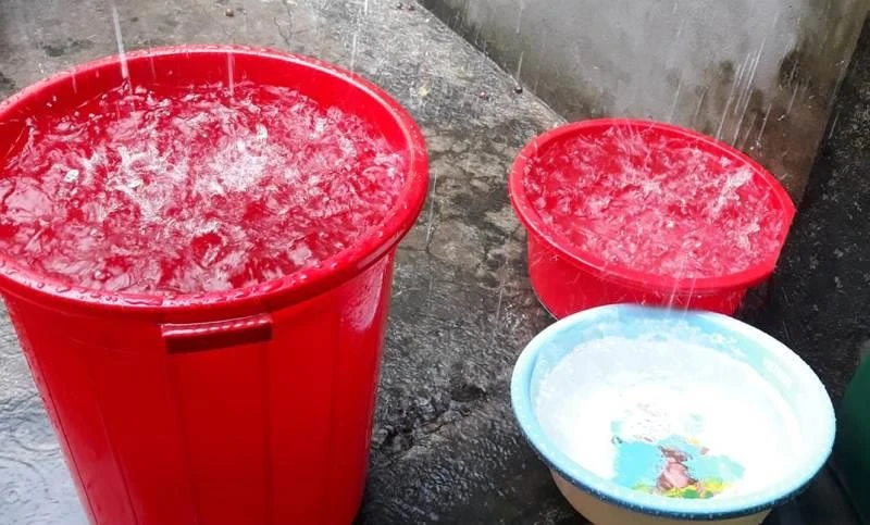 Ngày 3-9, người dân ở TP Vinh do bị cắt nước máy phải dùng xô, chậu tích trữ nước mưa để uống và sinh hoạt.