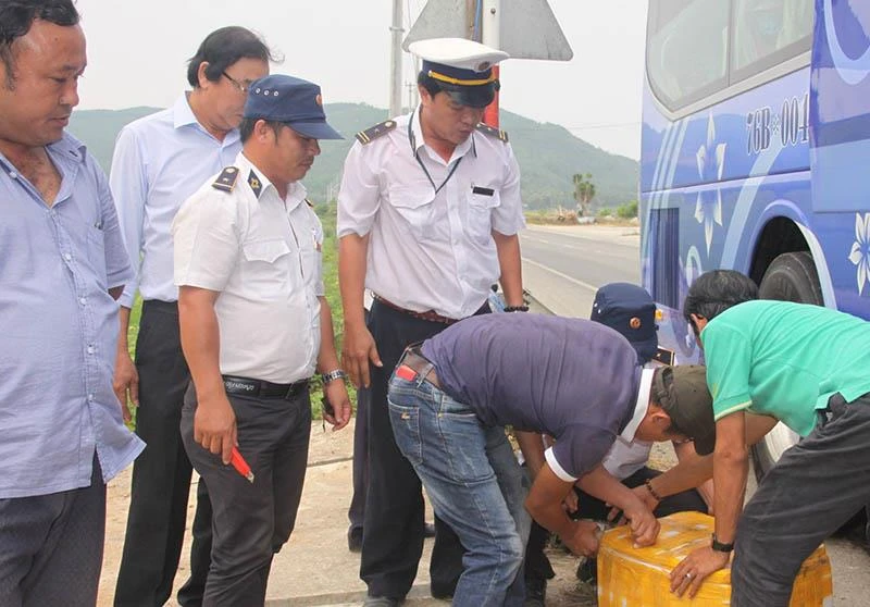 Các lực lượng chức năng tỉnh Bình Định kiểm dịch đối với hàng lưu thông trên quốc lộ. Ảnh: PHẠM TIẾN SỸ