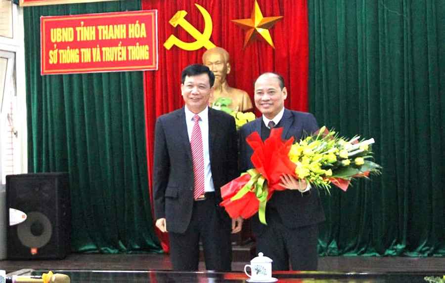 Giám đốc Sở TT&TT tỉnh Thanh Hóa Đỗ Hữu Quyết tặng hoa chúc mừng ông Lê Văn Nam, Tổng Biên biên tập Báo Văn Hóa - Đời Sống (trái) được bổ nhiệm giữ chức Phó Giám đốc Sở TT&TT tỉnh Thanh Hóa. Ảnh: N.HUẤN