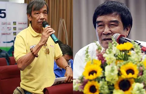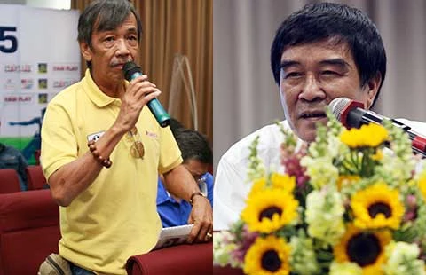 Phó Chủ tịch VFF Xuân Gụ (phải) mang tâm sự người lính đến với giải Fair Play. Ảnh trái: nhà báo lão làng Dư Hải đặt câu hỏi. Ảnh: XUÂN HUY