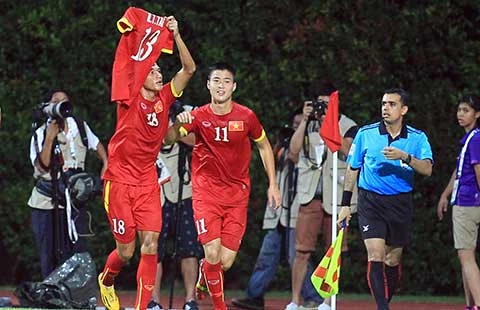 Hình ảnh đẹp và fair play ở SEA Games khi toàn đội gửi bàn thắng đến cho người đồng đội Tấn Tài mang chiếc áo số 13 dừng cuộc chơi sớm vì chấn thương. Ảnh: ANH PHƯƠNG