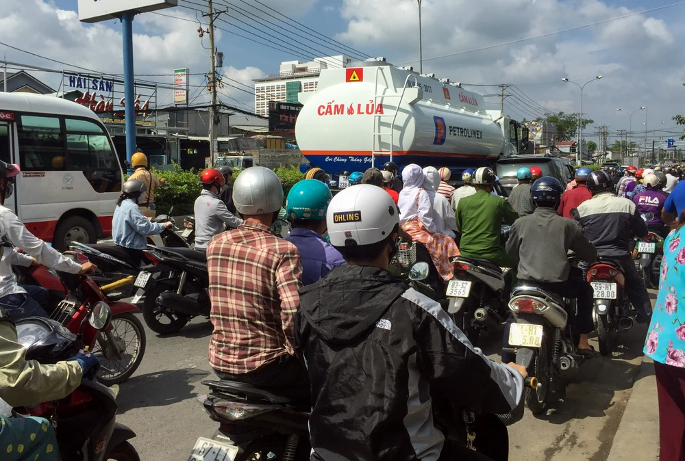Một vụ va chạm giao thông trên đường Nguyễn Văn Linh làn tắc đường kéo dài. Ảnh: CHÂU ANH