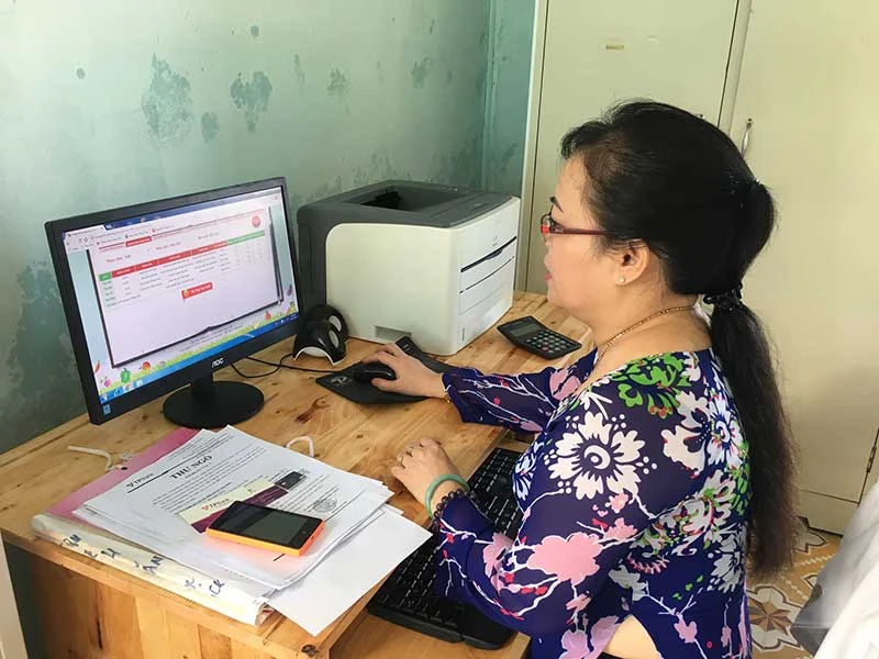 Cán bộ phụ trách dinh dưỡng Trường Tiểu học Nguyễn Phan Vinh (Đà Nẵng) đang thực hành trên phần mềm xây dựng thực đơn. Ảnh: CTV