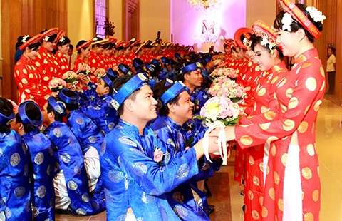 Các chú rể và cô dâu hạnh phúc trao/nhận hoa cưới. Ảnh: PHƯỚC TĨNH
