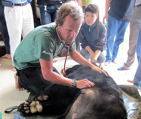 BS thú y Joost Phillipa (người Hà Lan) kiểm tra nhịp tim của Tí Mập. Ảnh: PN