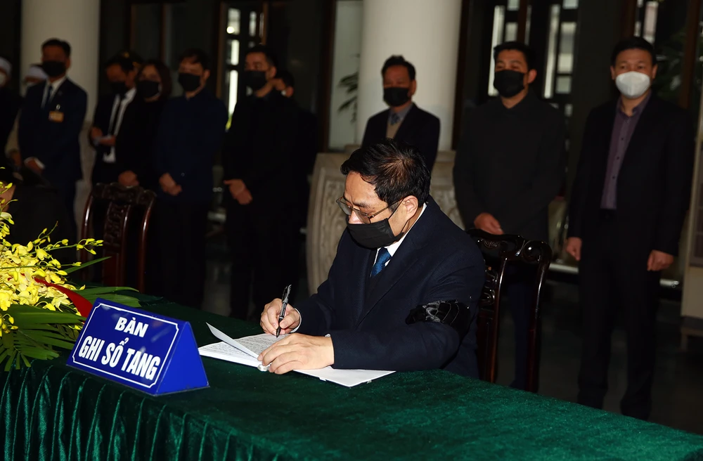 Thủ tướng Phạm Minh Chính ghi Sổ tang tại lễ viếng ông Nguyễn Côn. Ảnh: VGP