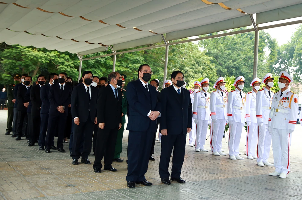 Ủy viên Bộ Chính trị, Thủ tướng Chính phủ Phạm Minh Chính dẫn đầu đoàn đại biểu Ban Chấp hành Trung ương Đảng Cộng sản Việt Nam vào viếng đồng chí Nguyễn Côn. Ảnh: VGP