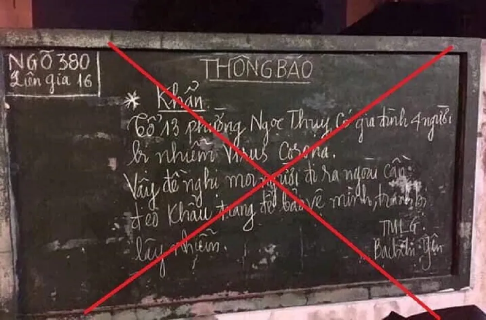 Trước đó, một số hội nhóm Facebook chia sẻ hình ảnh một tấm bảng thông báo ghi nội dung: “Tổ 13 phường Ngọc Thụy, Long Biên có gia đình 4 người bị nhiễm Virus Corona. Vậy đề nghị mọi người đi ra ngoài cần đeo khẩu trang, tránh lây nhiễm”.