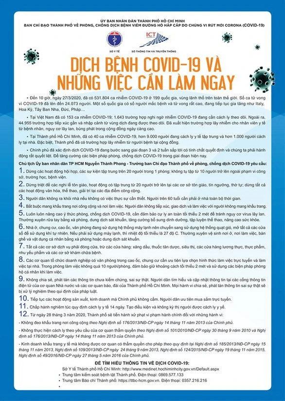 Ngày 27-3, Sở TT&TT TP.HCM cho biết TP sẽ triển khai phát 5 triệu tờ rơi nêu rõ "12 việc cần làm ngay" đến từng hộ dân trên địa bàn TP, huy động toàn dân chung tay tận dụng 14 ngày vàng phòng, chống dịch.