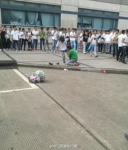 Theo chia sẻ của cư dân mạng, sự việc được cho là diễn ra tại 1 trường học của tỉnh Giang Tô, Trung Quốc. Có thể thấy, sau khi tặng hoa và tỏ tình không thành công, chàng trai đã quỳ xuống, ôm chặt lấy chân cô gái và khóc nức nở. Mặc cho cô liên tục giằng ra, chàng trai vẫn níu giữ không chịu buông.