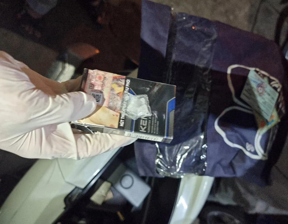 Qua kiểm tra hành chính, lực lượng chức năng phát hiện trong cốp xe của thanh niên trên có chứa 1 con dao và 1 gói thuốc lá hiệu KENT (vỏ ngoài gói thuốc có dán gói nilon kín vào trong chứa tinh thể không màu). Nam thanh niên khai nhận là ma túy đá và mua để sử dụng.