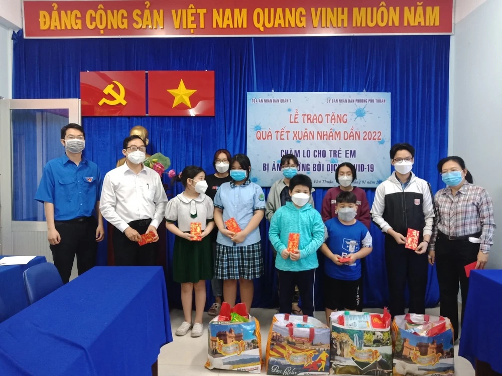 Mới đây, TAND Quận 7 (TP.HCM) đã phối hợp với Đảng ủy, UBND, UBMTTQ phường Phú Thuận tổ chức buổi lễ tặng quà tết cho trẻ em hoàn cảnh khó khăn mồ côi cha, mẹ vì COVID–19 trên địa bàn.