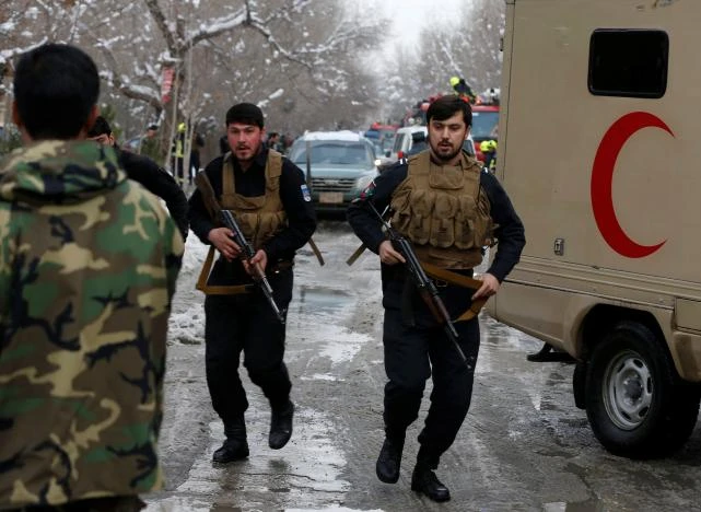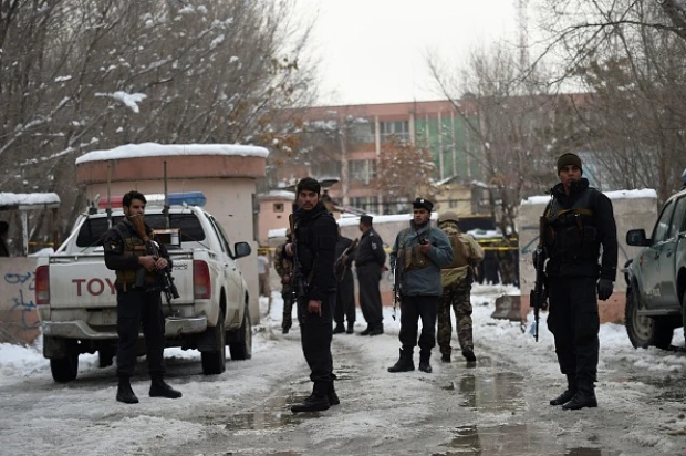 Nhân viên an ninh canh giữ tại hiện trường vụ ném bom tự sát trước Tòa án tối cao tại thủ đô Kabul, Afghanistan ngày 7-2. Ảnh: AP