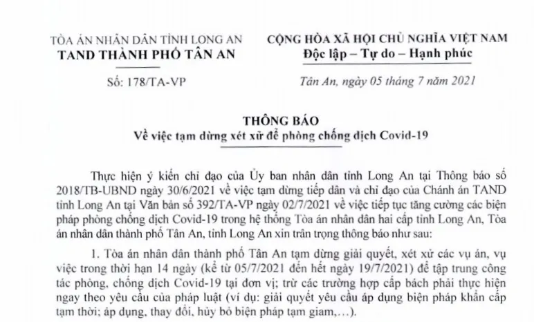 Ngày 5-7, Chánh án TAND TP.Tân An (tỉnh Long An) đã có thông báo về việc tạm dừng xét xử để phòng chống dịch COVID-19 gửi đến các nơi.