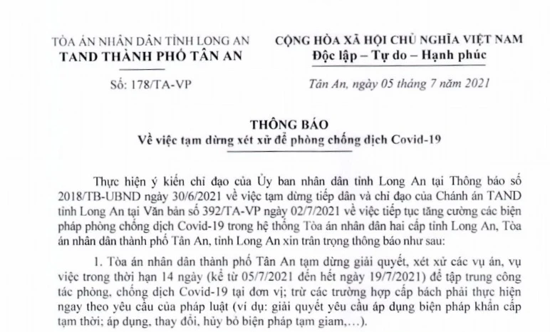 Theo thông báo, thực hiện ý kiến chỉ đạo của UBND tỉnh Long An về việc tạm dừng tiếp dân và chỉ đạo của Chánh án TAND tỉnh Long An về việc tăng cường các biện pháp phòng chống dịch COVID-19 trong hệ thống TAND hai cấp tỉnh, TAND TP Tân An tạm dừng giải quyết, xét xử các vụ án, vụ việc trong thời hạn 14 ngày kể từ 5-7.