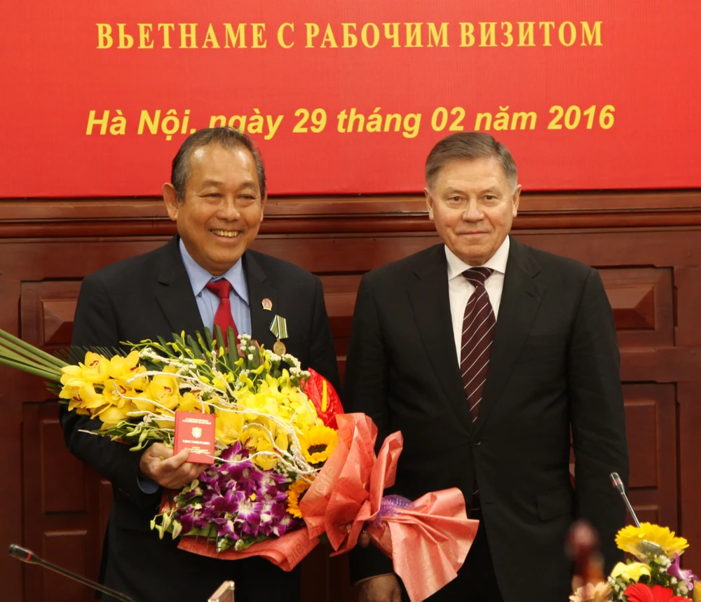 Đồng chí Trương Hòa Bình, Ủy viên Bộ Chính trị, Chánh án TAND Tối cao Việt Nam (trái) đã có buổi hội đàm với đồng chí V.M Lebedev, Chánh án Tòa án Tối cao Liên bang Nga.