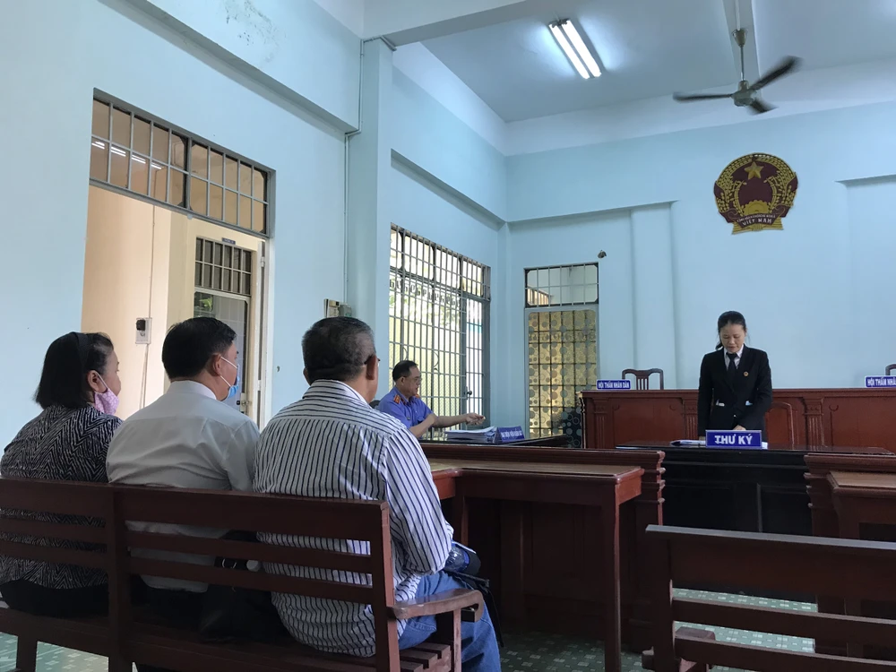 Phía bị đơn (ngồi) đang nghe thư ký phổ biến nội quy phiên tòa. Ảnh: YC