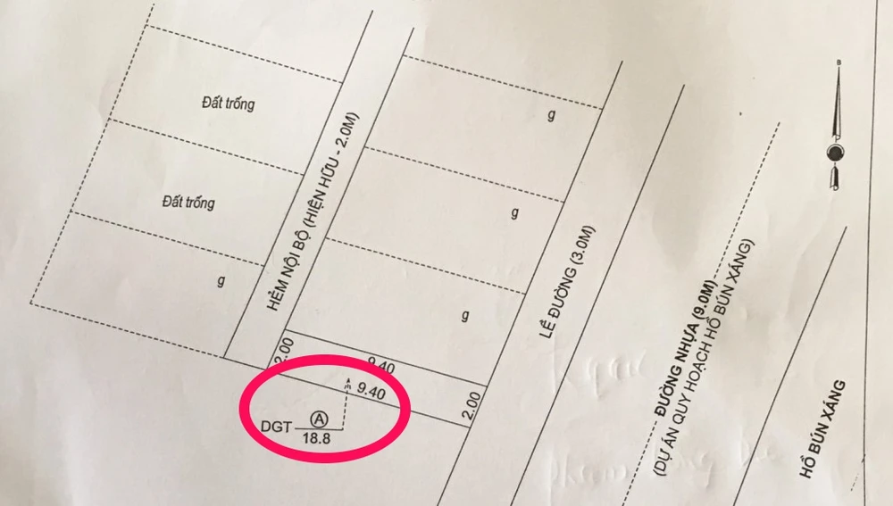 Phần đất của vợ chồng ông Hoài có một phần đã thành lòng đường và vỉa hè, còn lại 18,8 m2 (trong vòng tròn đỏ). Ảnh: NN