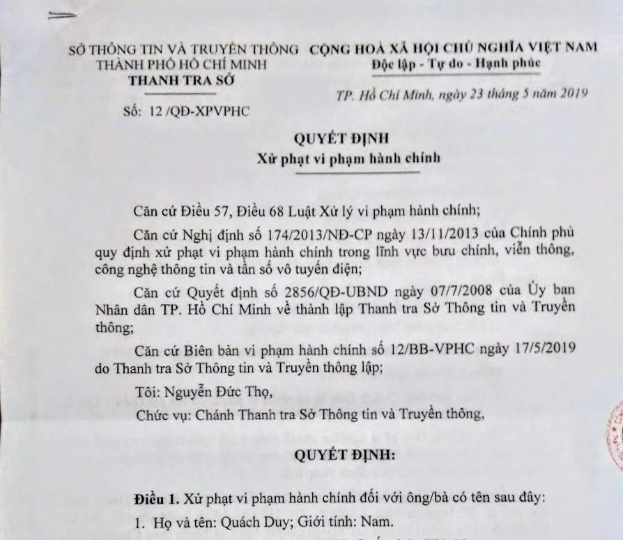 Theo đơn, ông Duy nộp đơn để khởi kiện Chánh Thanh tra Sở Thông tin và Truyền thông TP.HCM, người đã ký quyết định số 12/QĐ-XPVPHC về xử phạt vi phạm hành chính đối với ông.