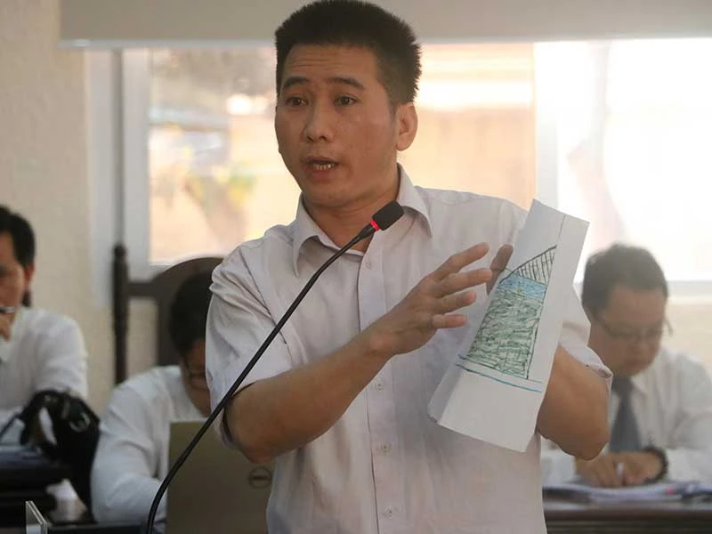 Bị cáo Nguyễn Thành Luân giải thích quá trình đo vẽ của mình khi làm hồ sơ cấp giấy chứng nhận quyền sử dụng đất. Ảnh: LA