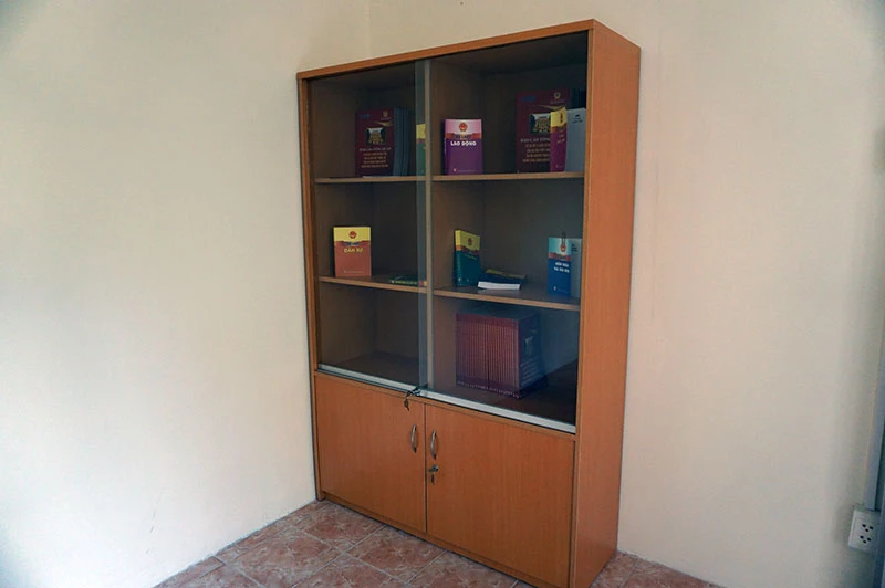 Phòng hòa giải có bộ ghế salon, nước uống và tủ sách luật dành cho các đương sự có nhu cầu tìm hiểu.