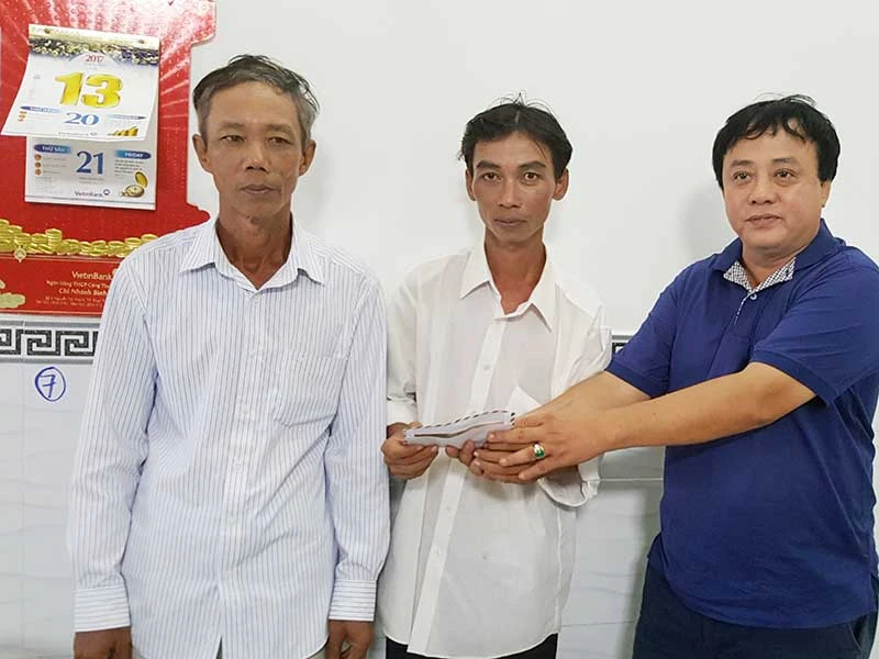 Sau phiên tòa, PV Pháp Luật TP.HCM (phải)đã trao tiền của bạn đọc hỗ trợ hai nông dân bị kết án. Ảnh: BPN