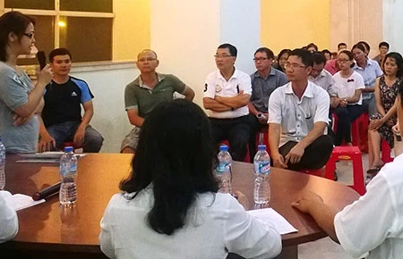 Cư dân cao ốc Phú Thọ - Thuận Việt trình bày quan điểm với tòa án và ban quản trị trong cuộc họp ngày 10-6. Ảnh: PT
