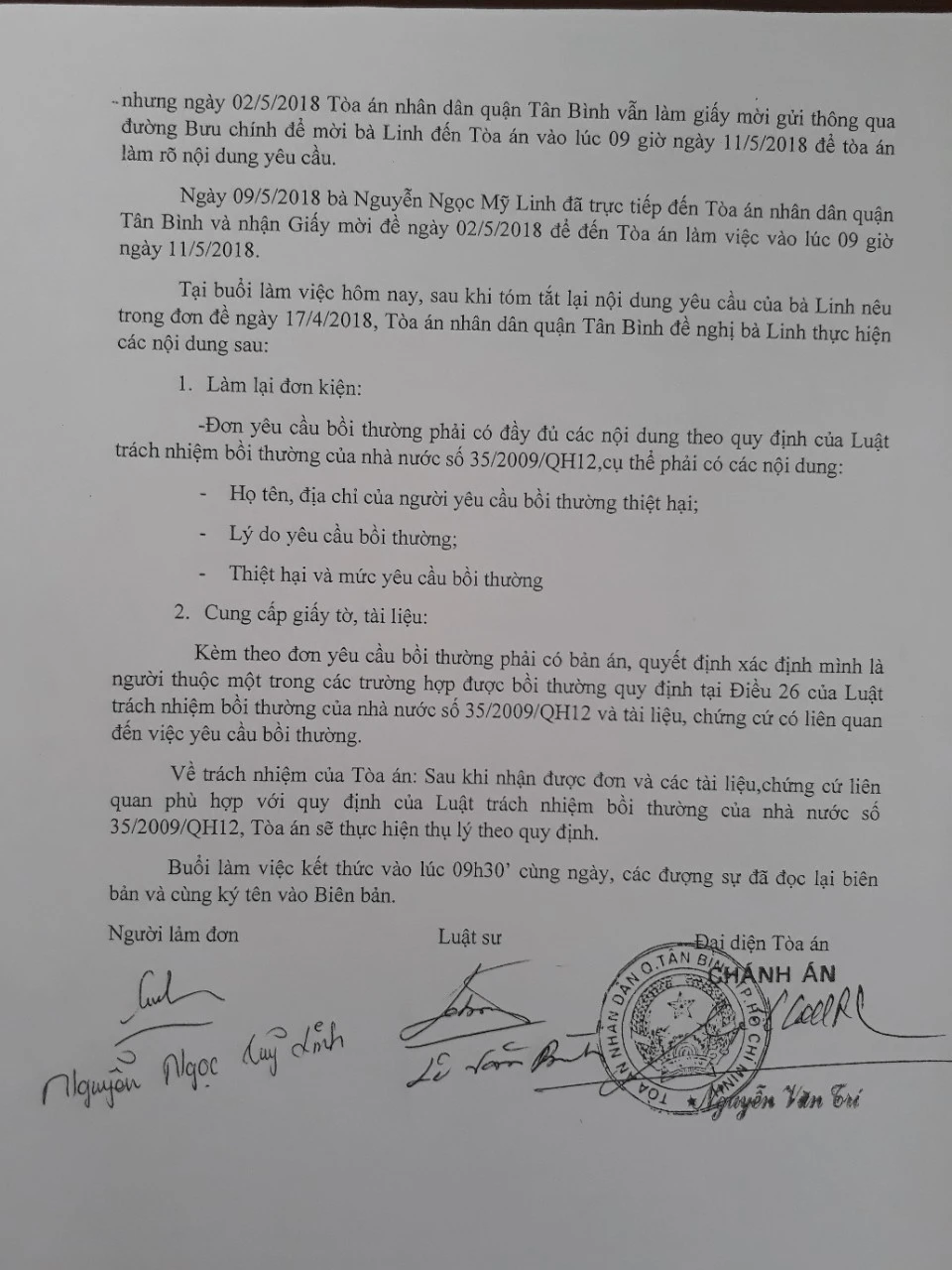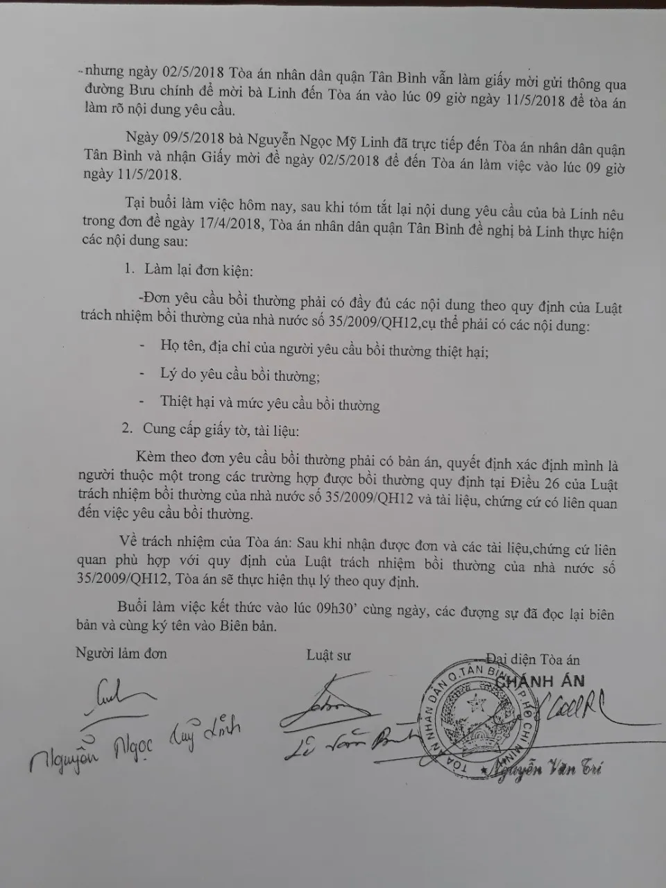 Thẩm phán Nguyễn Văn Trí, Chánh án TAND quận Tân Bình, đã hướng dẫn cô làm lại đơn yêu cầu bồi thường theo quy định của Luật Trách nhiệm bồi thường của Nhà nước, nêu rõ lý do yêu cầu bồi thường, nêu cụ thể các thiệt hại và mức yêu cầu bồi thường. Kèm theo đơn yêu cầu bồi thường phải có bản án, quyết định xác định Mỹ Linh là người thuộc một trong các trường hợp được bồi thường theo quy định tại Điều 26 Luật Trách nhiệm bồi thường của Nhà nước và tài liệu, chứng cứ có liên quan đến việc yêu cầu bồi thường.