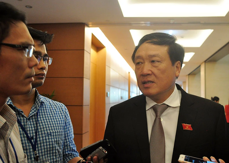 Chánh án TAND Tối cao Nguyễn Hòa Bình trao đổi với báo chí bên lề Quốc hội về việc bồi thường cho ông Huỳnh Văn Nén vào sáng nay 28-10.