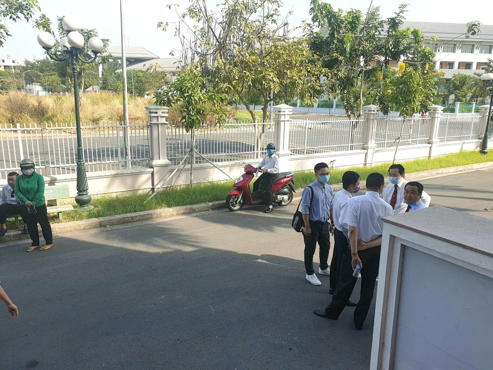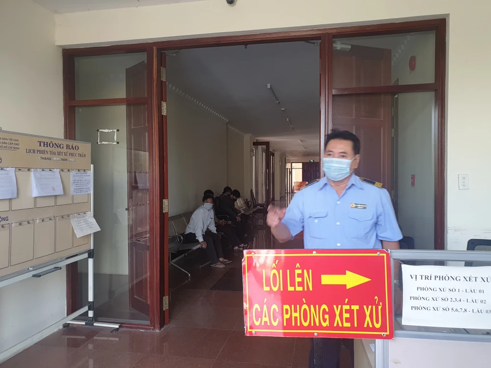 Trong khuôn viên tòa án, người dân đều được nhắc nhở mang khẩu trang. Ảnh: HY