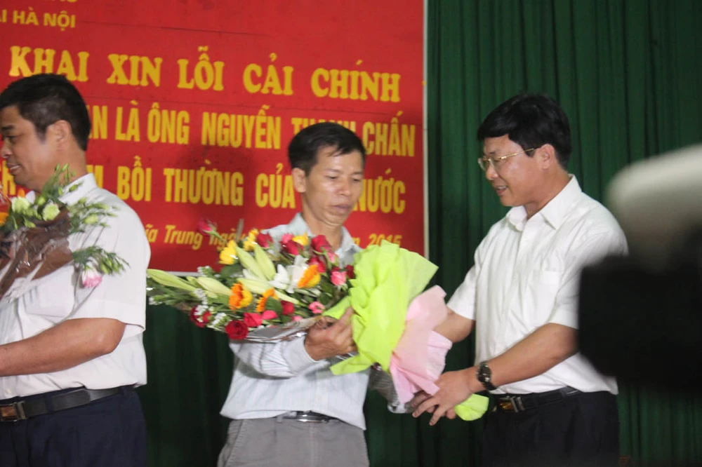Khi ông Chấn bước vào trụ sở UBND xã Nghĩa Trung, hàng trăm người dân cố chen chân để được nhìn thấy ông Chấn. Ông Chấn điềm tĩnh, lặng lẽ đi giữa dòng người, gương mặt khắc khổ. Khi lên nhận hoa của Tòa, ông Chấn mới cởi bỏ được khuôn mặt buồn bã, dưng dưng xúc động khi đại diện cơ quan tố tụng đọc lời xin lỗi.
