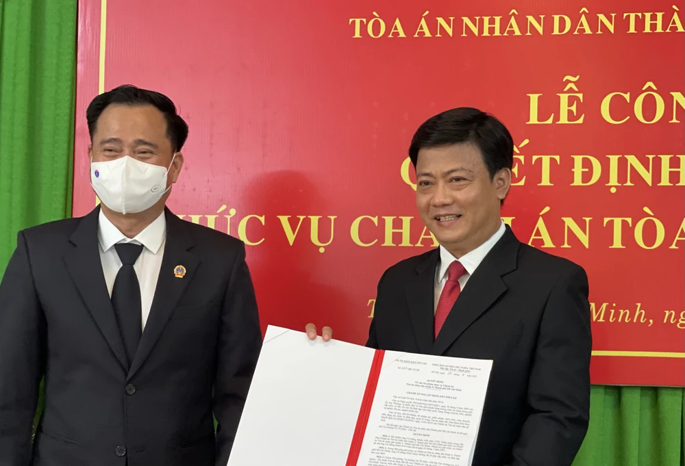Chánh án TAND TP.HCM Lê Thanh Phong trao quyết định bổ nhiệm chức vụ Chánh án TAND quận 5 cho ông Cô Hồng Mười. Ảnh: HOÀNG YẾN