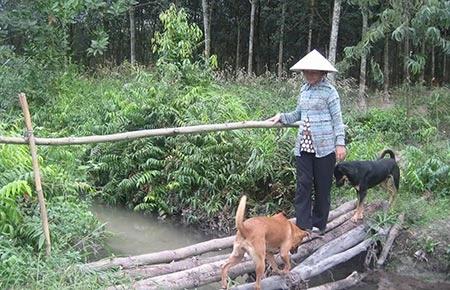 Lối đi duy nhất để ra ngoài là cây cầu tràm mà chỉ cần một trận mưa lớn là trôi theo dòng nước.
