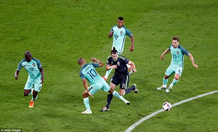 Siêu sao Gareth Bale thi đấu rất nổi bật ở hiệp 1. Phút thứ 23, cầu thủ đắt giá nhất thế giới có pha đi bóng tốc độ từ phần sân nhà đến trước vòng cấm Bồ Đào Nha, Bale quyết định dứt điểm thẳng nhưng bóng lại tìm đúng vị trí của thủ thành Patricio.